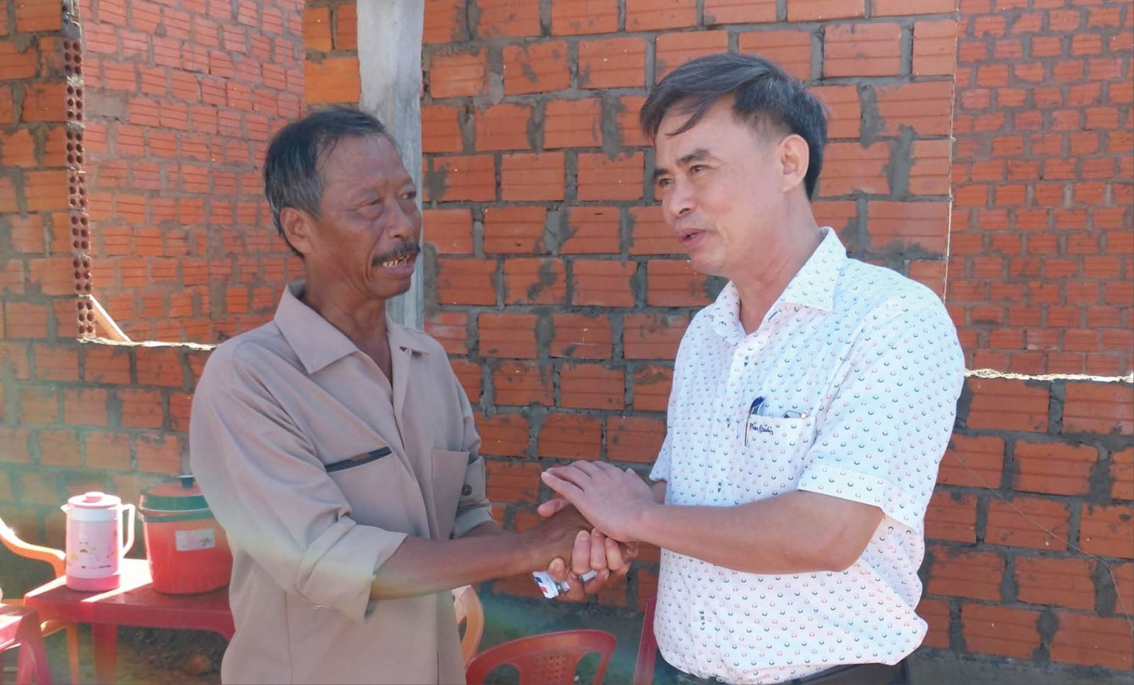 Bí thư Thị ủy Hương Thủy Lê Ngọc Sơn (phải) chia vui với ông Lê Xuân Dũng khi ngôi nhà mới ở khu TĐC sắp hoàn thành