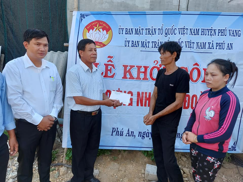 Lãnh đạo huyện Phú Vang trao tiền hỗ trợ cho gia đình ông Hữu tại lễ khởi công
