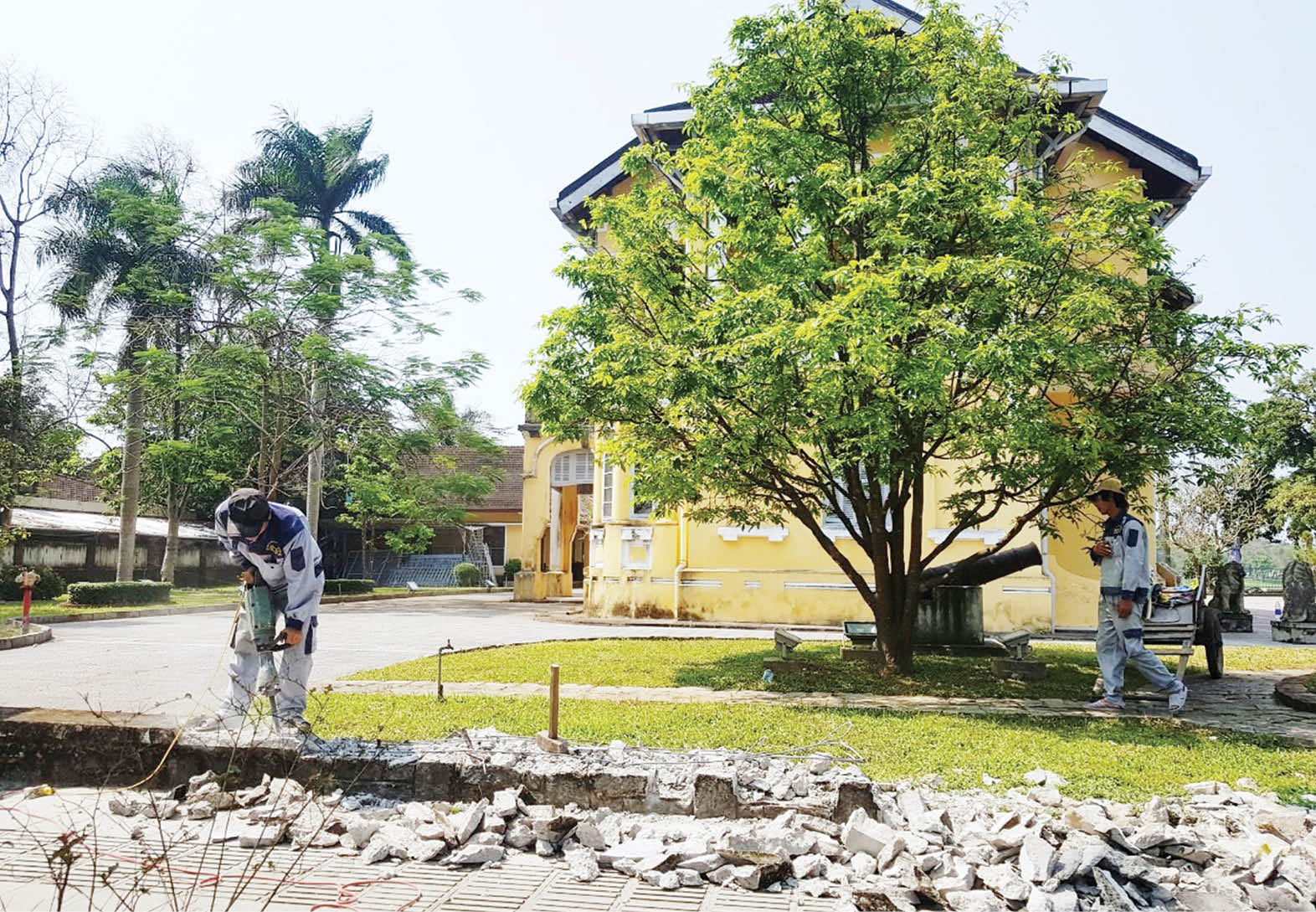 Dọc theo đó không xa, các công nhân sau khi hạ giải lớp sắt đã tiến hành khoan cắt hệ thống bê tông của hàng rào thuộc Trung tâm Văn hóa, Thông tin và Thể thao TP. Huế (trước kia là Bảo tàng Văn hóa Huế) ở số 23 – 25 Lê Lợi. Hàng rào kiên cố, kéo dài gần cả trăm mét cứ thế lần lượt hạ xuống, không gian bên trong và bên ngoài thật sự gắn kết, không còn khoảng cách cũng như sự “bức bí” vốn có trước đó. Ngôi nhà cổ kính với lối kiến trúc Pháp cứ thế hiện ra một cách sang trọng, lạ mắt ở nhiều góc nhìn khác nhau khi không còn lớp hàng rào “kín cổng cao tường” như trước.