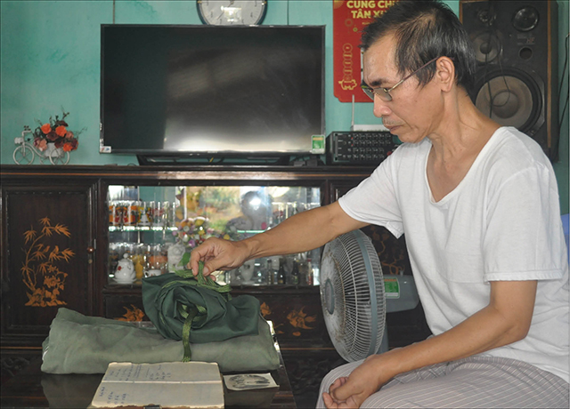 Ông Nguyễn Đình Trung lần mở các kỷ vật của liệt sĩ Nguyễn Đình Nam, anh trai mình
