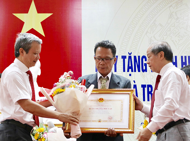 UVTW Đảng, Bí thư Tỉnh ủy, Chủ tịch HĐND tỉnh Lê Trường Lưu (trái) và Phó Bí thư Tỉnh ủy, Chủ tịch UBND tỉnh, Trưởng Đoàn ĐBQH tỉnh Phan Ngọc Thọ (phải) trao Huân chương Độc lập cho các gia đình có nhiều cống hiến với đất nước. Ảnh: MINH NGUYÊN