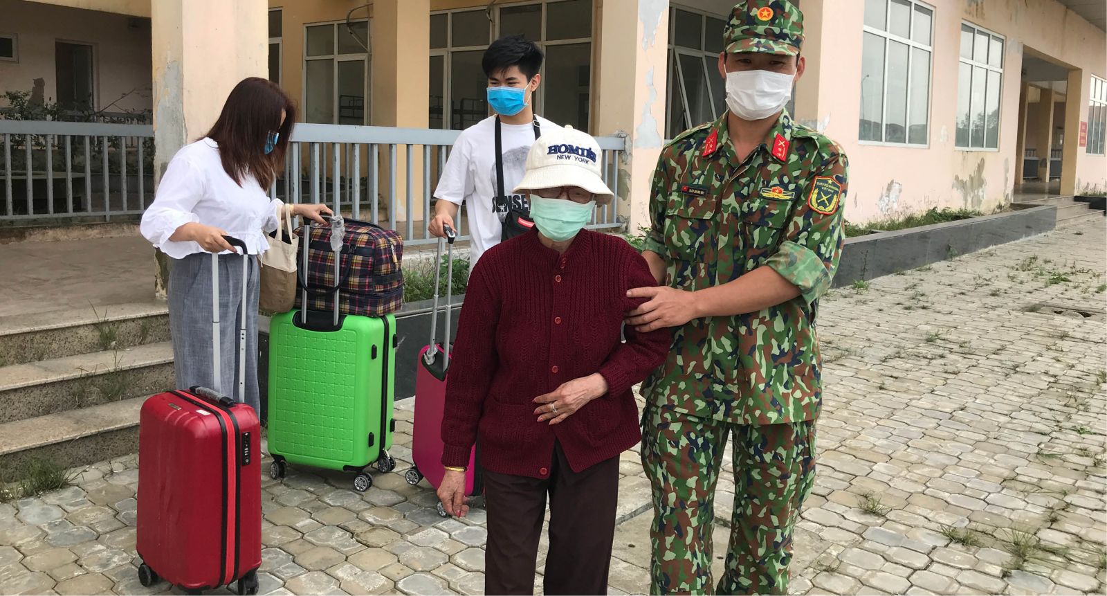 Trung uý QNCN Trần Quang Huy tiễn người dân về nhà sau khi hoàn thành thời gian cách ly