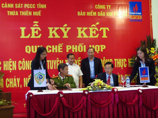 Chiều tối 23/12, tại khách sạn Century, Cảnh sát PC&CC tỉnh Thừa Thiên Huế và Công ty Bảo hiểm Dầu khí PVI Huế đã cùng nhau ký kết quy chế phối hợp. Tham dự và chứng kiến buổi lễ ký kết có ông Đinh Khắc Đính, Phó Chủ tịch UBND tỉnh.