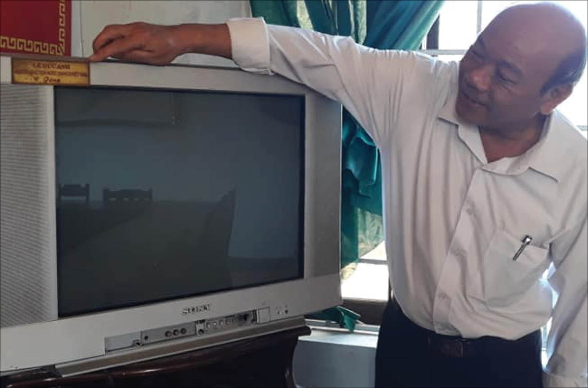 Ông Nguyễn Văn Phượng, Bí thư Đảng ủy xã Vinh Phú bên cạnh chiếc ti vi - kỷ vật của Đại tướng Lê Đức Anh