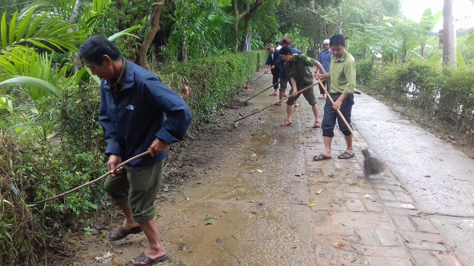| Lực lượng dân quân tự vệ xã Phong Hòa dọn dẹp vệ sinh tại làng cổ Phước Tích |