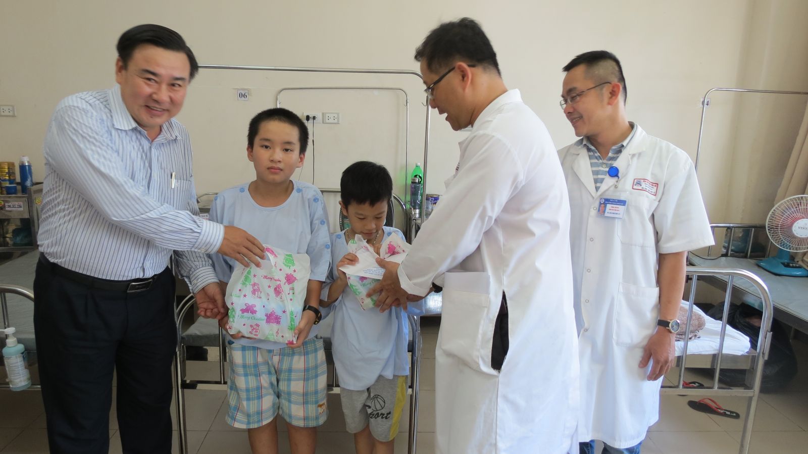 | Ông Võ Văn Vui, Phó Bí thư Thường trực Huyện ủy Phong Điền trao quà cho các cháu tại - Cơ sở 2 Bệnh viện Trung ương Huế |