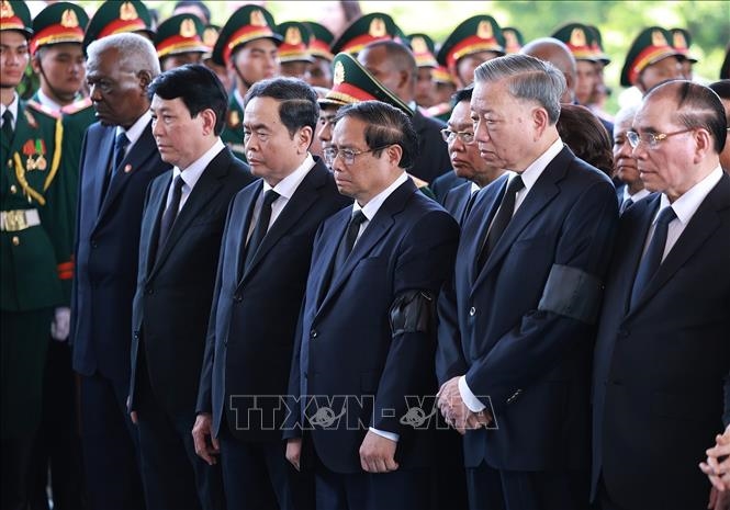 | Các đồng chí lãnh đạo, nguyên lãnh đạo Đảng, Nhà nước, đại biểu trong nước và quốc tế dự Lễ an táng Tổng Bí thư Nguyễn Phú Trọng. Ảnh: TTXVN |