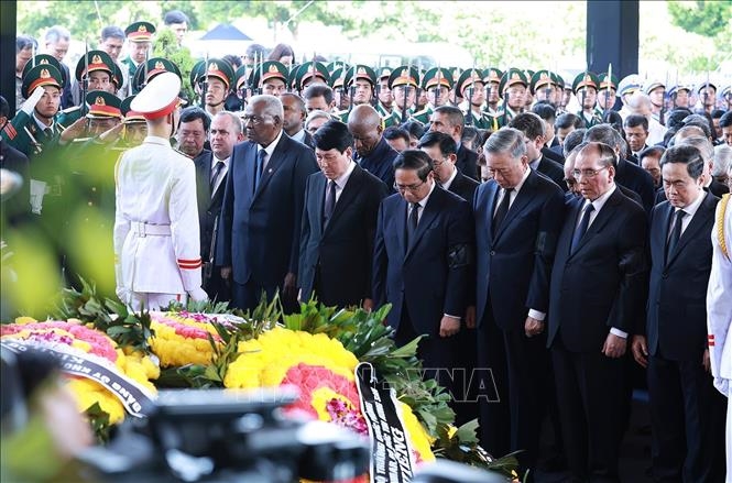 | Các đồng chí lãnh đạo, nguyên lãnh đạo Đảng, Nhà nước, đại biểu trong nước và quốc tế mặc niệm Tổng Bí thư Nguyễn Phú Trọng. Ảnh: TTXVN |
