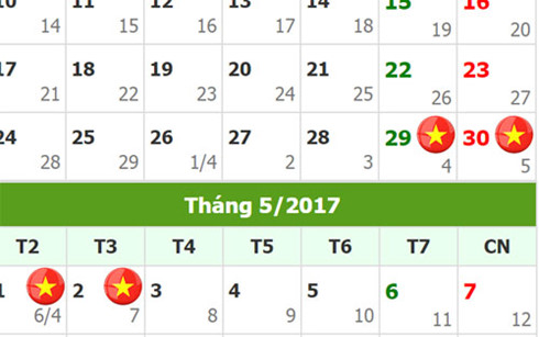 Được nghỉ 3 ngày liên tục từ ngày 30/4 đến hết ngày 2/5/2017 (trong đó, ngày 2/5 là ngày nghỉ bù cho ngày 30/4 - Chủ nhật).