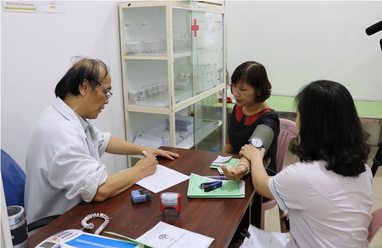 Bác sĩ của Phòng khám đa khoa Âu Lạc - Thanh Sơn kiểm tra sức khỏe cho đoàn viên