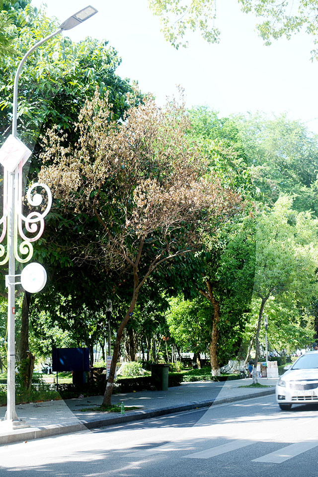 Đang miên man bao đồng như vậy thì chợt thảng thốt khi phát hiện thêm một gốc long não nữa ở khu vực trước nhà văn hóa thiếu nhi cũng có hiện tượng khô lá hết 2/3 cây. Nguy cơ cây chết là hiện hữu. Tiếc, và cả lo nữa. Đánh xe chạy một vòng dọc đường Lê Lợi thử xem. Lại phát hiện thêm một cây khác ở đối diện mé phải cổng Bệnh viện TW Huế cũng bị khô “toàn tập”. Điều đáng nói là 2 cây trước có thể chết do quá già, không đủ sức chống chọi với các loại sâu bệnh. Còn cây trước cổng bệnh viện mới chỉ là cây tơ, cây cao chừng 6m, đường kính gốc chừng mười lăm, mười bảy phân gì đấy. Cách đây chưa lâu thấy vẫn còn mơn mởn xanh, nay sao nên nỗi.