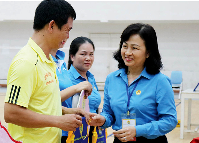 Bà Nguyễn Khoa Hoài Hương, Chủ tịch LĐLĐ tỉnh trao cờ lưu niệm cho vận động viên tại Hội thao đoàn viên Công đoàn
