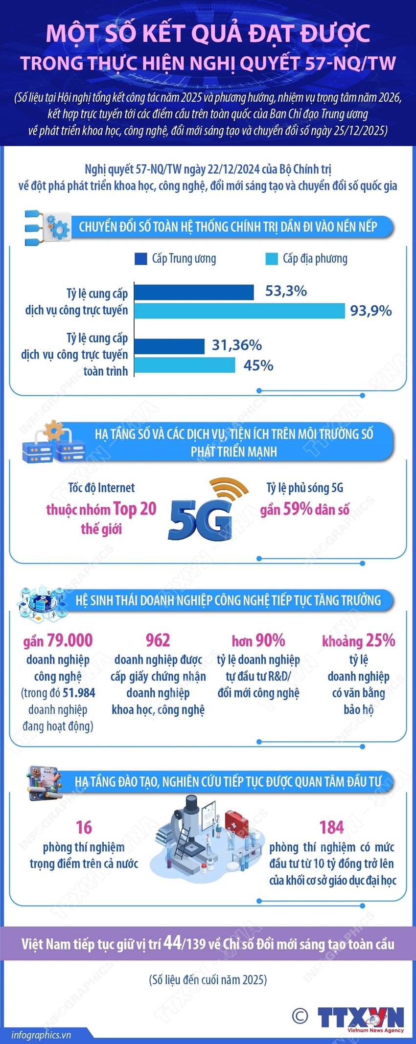 Theo Báo cáo tóm tắt kết quả thực hiện Nghị quyết 57-NQ/TW, Công tác xây dựng, hoàn thiện thể chế có bước đột phá, với 30 luật được Quốc hội thông qua, Chính phủ đã ban hành 68 nghị định...
