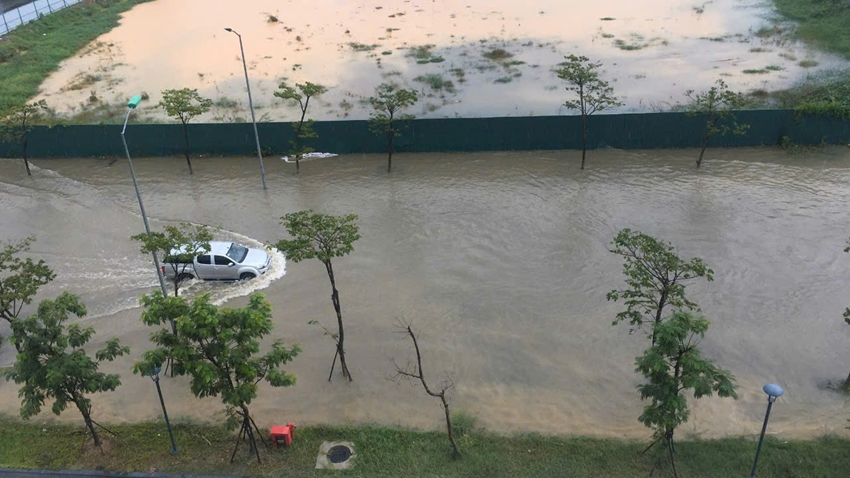 Đường Hoàng Lanh thuộc khu đô thị An Vân Dương bị ngập cục bộ khiến phương tiện di chuyển khó khăn