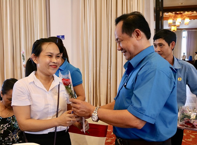Ông Trần Văn Đồng, Phó Chủ tịch LĐLĐ TP. Huế tặng hoa cho cán bộ nữ nhân Ngày Phụ nữ Việt Nam