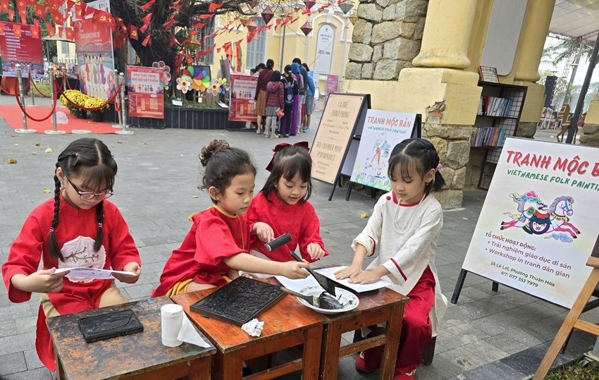 Bên cạnh đó, không gian trải nghiệm văn hóa - ẩm thực Tết Huế với gần 30 gian hàng đã mang đến cho người dân nhiều hoạt động hấp dẫn như: giới thiệu sách, đồ chơi dân gian, các nghề thủ công truyền thống và những món bánh Tết gắn liền với ký ức nếp nhà xưa. Các hoạt động tô ông Táo, nặn tò he, làm hoa giấy Thanh Tiên, viết thư pháp, làm bánh… không chỉ tạo sân chơi bổ ích cho trẻ em mà còn góp phần bảo tồn, phát huy các giá trị văn hóa truyền thống của vùng đất Cố đô.