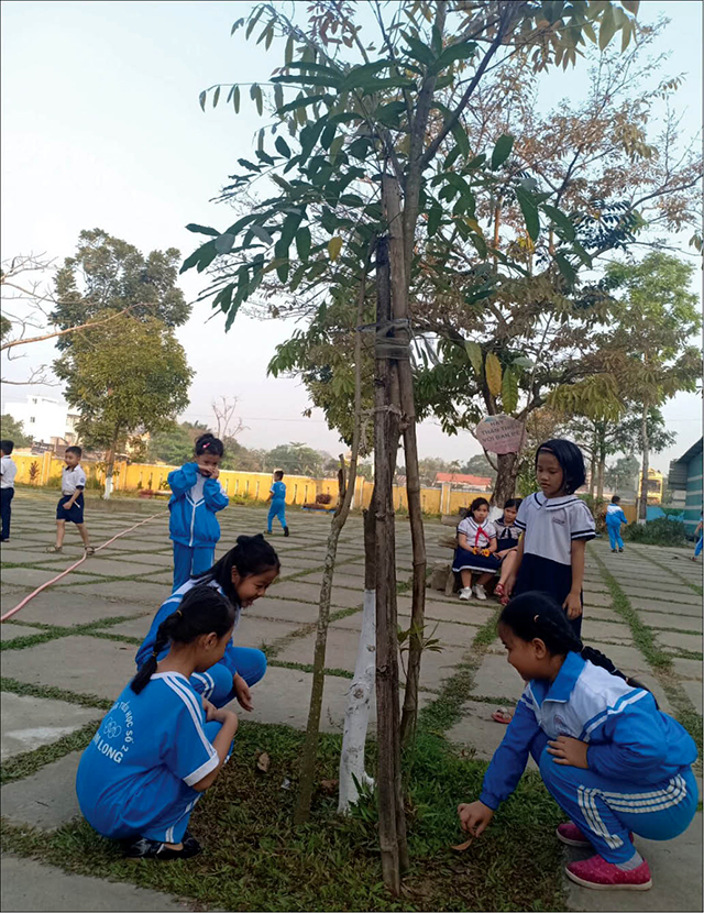 Các em học sinh Trường tiểu học Kim Long bên cây xanh được anh Cường trồng