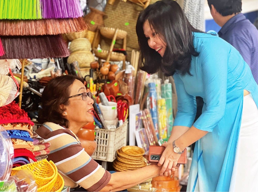| Bà Hoàng Thị Như Thanh (mặc áo dài) gần gũi với chị em tiểu thương chợ Đông Ba |
