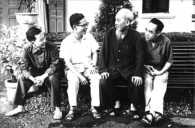 Bác Hồ hội kiến cùng nhà thơ Tố Hữu và các nhà văn miền Nam Phan Tứ, Trần Đình Vân. (Ảnh tư liệu)