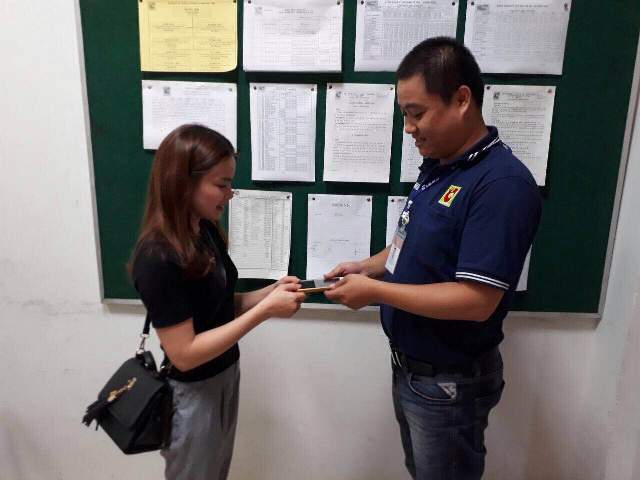 Chị Tiến giao điện thoại nhặt được cho bộ phận bảo vệ để trả lại cho khách