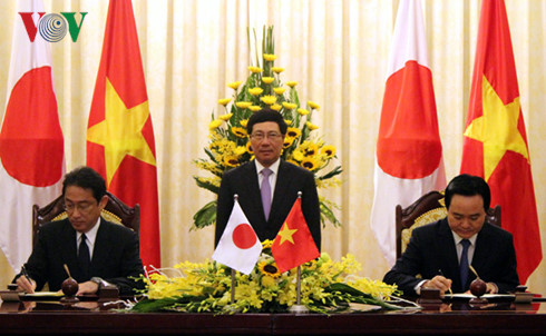 Phó Thủ tướng, Bộ trưởng Ngoại giao Phạm Bình Minh đã chứng kiến lễ ký Công hàm trao đổi viện trợ không hoàn lại của Chính phủ Nhật Bản tài khóa 2016 cho “Dự án học bổng phát triển nguồn nhân lực” trị giá 390 triệu Yên giữa Bộ trưởng Bộ Giáo dục và Đào tạo Việt Nam Phùng Xuân Nhạ và Bộ trưởng Ngoại giao Nhật Bản Fumio Kishida.