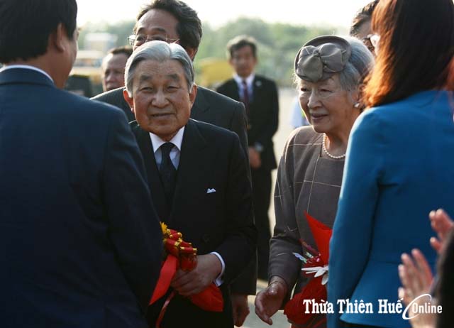 Đón và chúc mừng Nhà Vua và Hoàng hậu tại sân bay có ông Nguyễn Ngọc Thiện, UVTW Đảng, Bộ trưởng Bộ Văn hóa Thể thao-Du lịch, cùng phu nhân; ông Nguyễn Văn Cao, Phó Bí thư Tỉnh ủy, Chủ tịch UBND tỉnh, lãnh đạo các sở, ban ngành và đông đảo người dân, học sinh, tình nguyện viên, các hãng thông tấn báo chí Việt Nam, Nhật Bản.