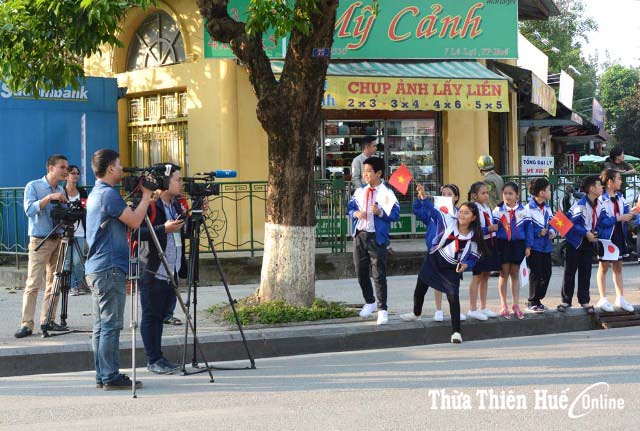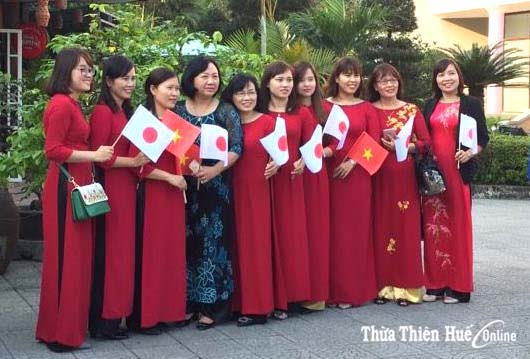 Các cô giáo Trường tiểu học Vĩnh Ninh cầm cờ Việt - Nhật đón Nhật Hoàng và Hoàng hậu
