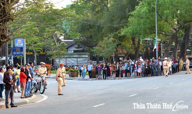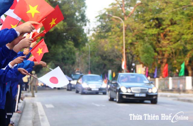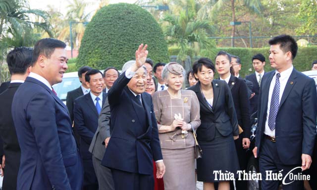 Đến khoảng 17 giờ 10 phút, đoàn xe tháp tùng Nhà vua và Hoàng hậu Nhật Bản tiến đến khách sạn La Residence trong sự chào đón nồng nhiệt của người dân Cố đô. Nhiều du khách Nhật cũng đón chờ chuyến thăm lịch sử này. Chị Misako, du khách đến từ Nhật Bản cho biết: “Tôi rất yêu Huế, tôi đã đến Huế 9 lần rồi. Đây là một thành phố tuyệt đẹp, người dân cũng cực kỳ thân thiện. Tôi ngạc nhiên khi Nhà Vua đến đây và muốn tận mắt nhìn thấy ông ấy. Tôi chưa từng có cơ hội diện kiến Người ở Nhật Bản, vì vậy, tôi rất hào hứng”.