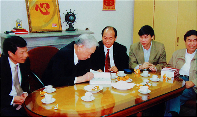 Đại tướng Lê Đức Anh ghi vào hồi ký tặng tác giả (từ trái sang: đồng chí Nguyễn Ngọc Thiện, UVTW Đảng, Bộ trưởng Bộ Văn hóa, Thể thao và Du lịch; Đại tướng Lê Đức Anh, đồng chí Nguyễn Văn Bòn. Ảnh: TÁC GIẢ CUNG CẤP