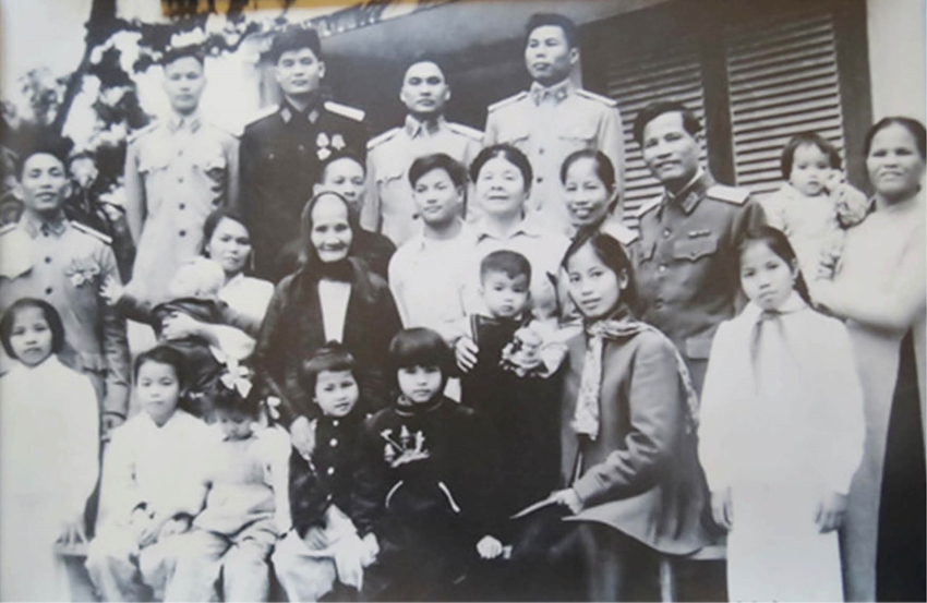 | Mẹ Đại tướng Nguyễn Chí Thanh (ở giữa choàng khăn) cùng vợ chồng Đại tướng (thứ 3 và 4, hàng thứ hai từ phải qua) và các con cháu. Ảnh: thanhnien.vn |