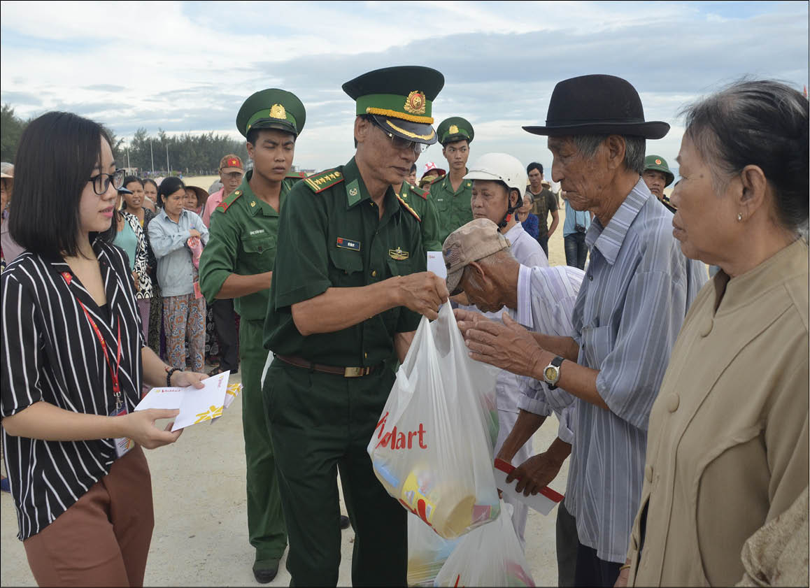 Đại tá Vũ Văn Uy tặng quà của BĐBP cho người dân