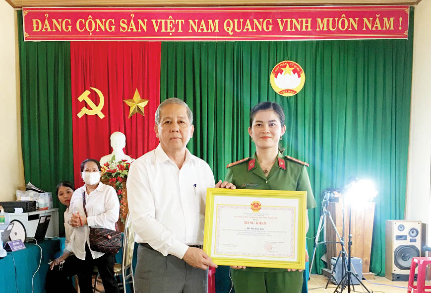 Nhiều hoài bão, tâm huyết trong công việc, Đại úy Kim Anh đóng góp sức mình cùng tập thể Công an huyện thực hiện Đề án cấp CCCD vượt chỉ tiêu đề ra, được Chủ tịch UBND tỉnh tặng Bằng khen. Riêng cá nhân chị vinh dự được Chủ tịch UBND tỉnh đến thăm hỏi, động viên và trực tiếp trao tặng Bằng khen.