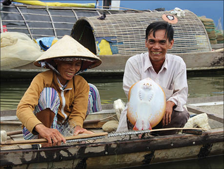 Vợ chồng ông Nguyễn Cư vui mừng bắt được con cá đuối lớn