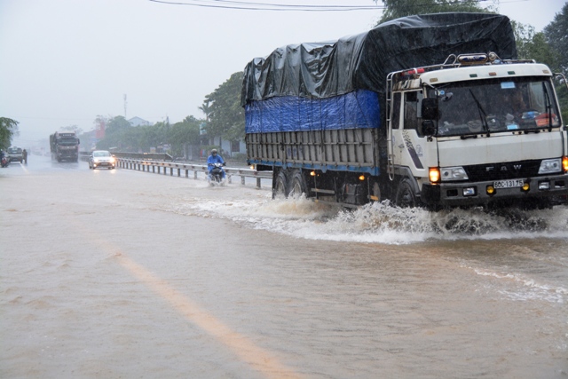 Quốc lộ 1A qua xã Lộc Trì đến 16h ngày 14/12 vẫn còn ngập nặng. Ảnh: Đức Quang