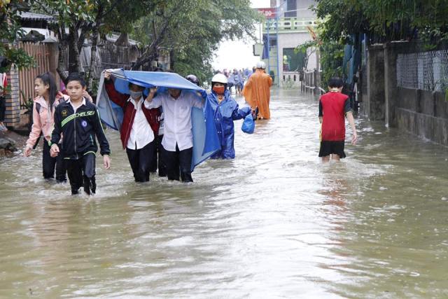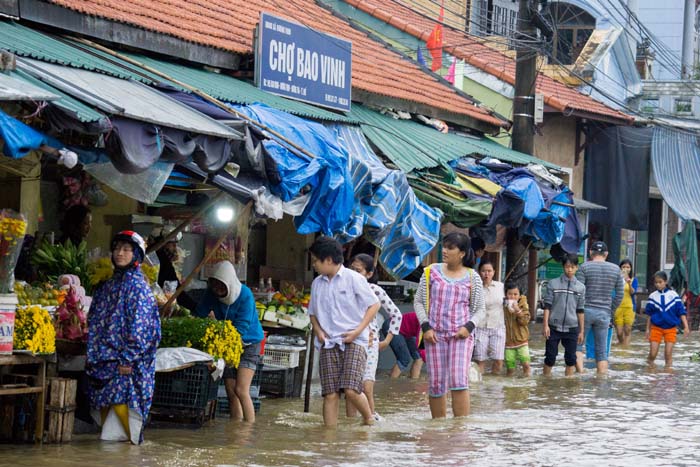 Người dân lội nước đi chợ Bao Vinh. Ảnh: Tấn Khang