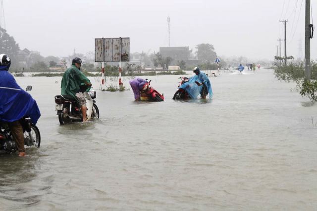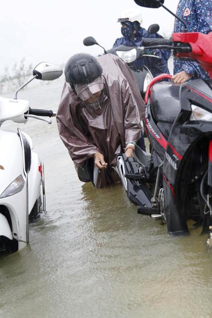 Vì nước ngập sâu, nhiều người dân bị ngã xe đoạn về Hương Vinh (Hương Trà )- Sịa (Quảng Điền) . Ảnh: Ngọc Thắng