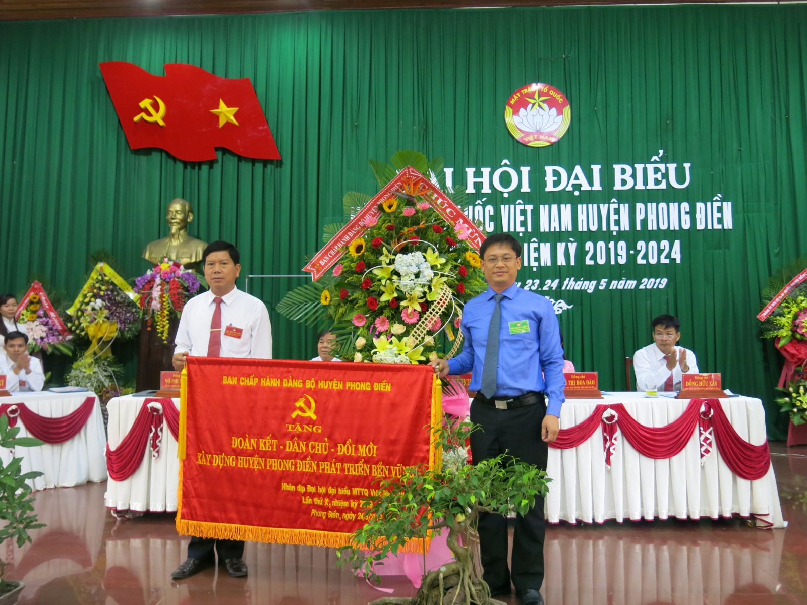 Bí thư Huyện ủy Phong Điền Nguyễn Thanh Bình (phải) tặng bức trướng với dòng chữ "Đoàn kết - dân chủ - đổi mới xây dựng Phong Điền phát triển bền vững" cho UBMTTQVN huyện Phong Điền