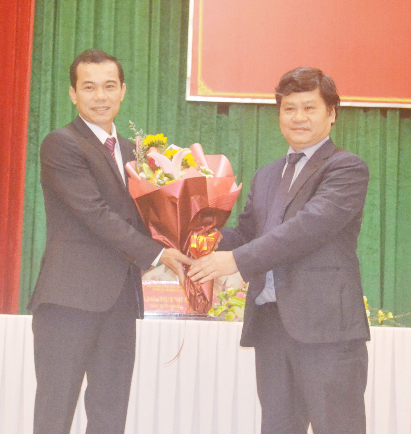 Chủ tịch UBND TP. Huế Nguyễn Văn Thành (phải) tặng hoa chúc mừng tân Phó Chủ tịch UBND TP. Huế Võ Lê Nhật