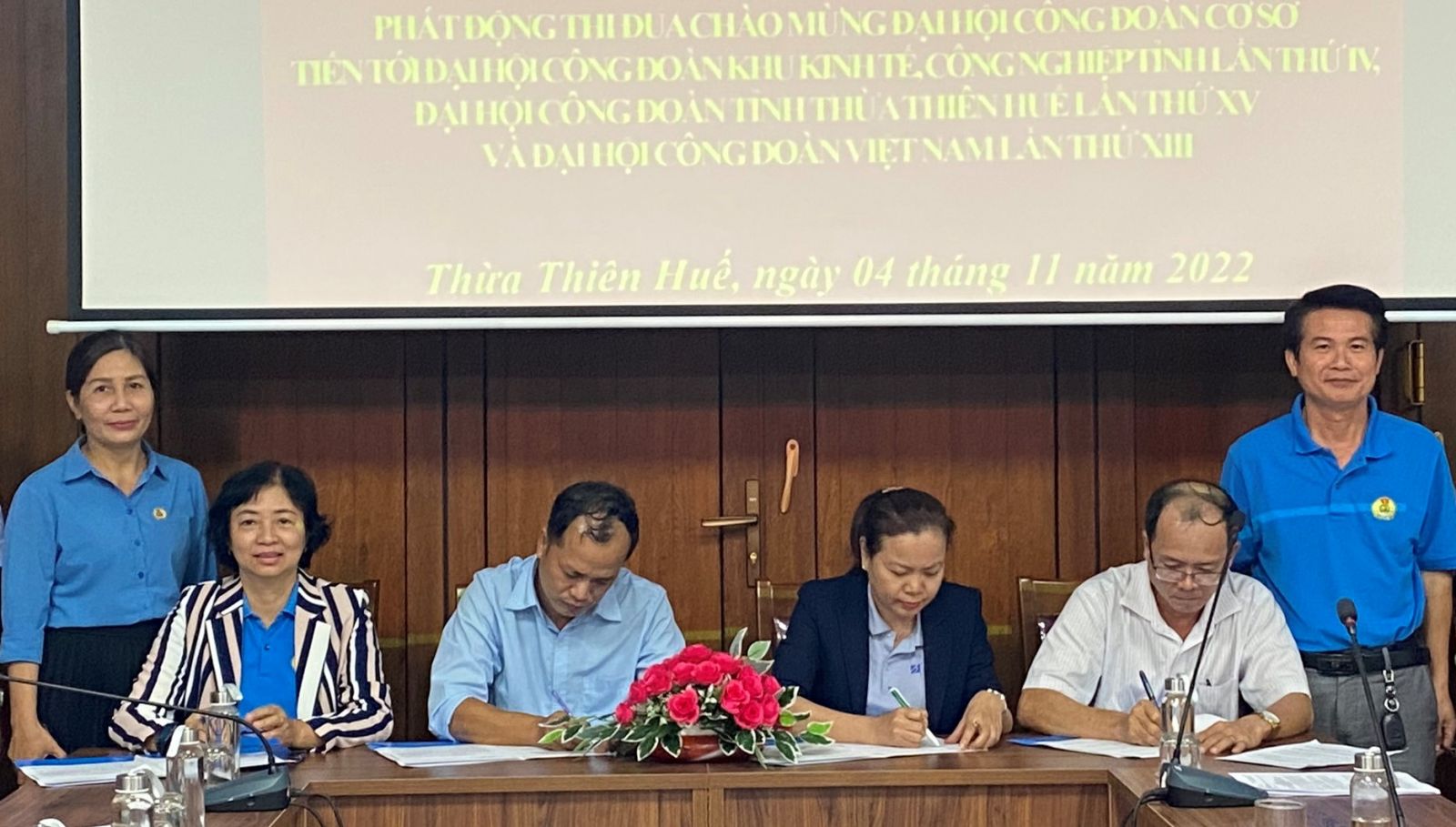 Dịp này, Công đoàn Khu Kinh tế Công nghiệp tỉnh ký kết thi đua chào mừng đại hội công đoàn các cấp với 6 nội dung cụ thể. Trong đó, tập trung thi đua “Đảm nhận, thực hiện công trình, phần việc công đoàn”; thực hiện giai đoạn 2 chương trình “1 triệu sáng kiến - nỗ lực vượt khó, sáng tạo, quyết tâm chiến thắng đại dịch COVID-19”; “Phát triển đoàn viên”; phấn đấu 100% công đoàn cơ sở thi đua chào mừng đại hội công đoàn các cấp.