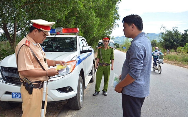 Cảnh sát giao thông kiểm tra, xử lý người vi phạm.