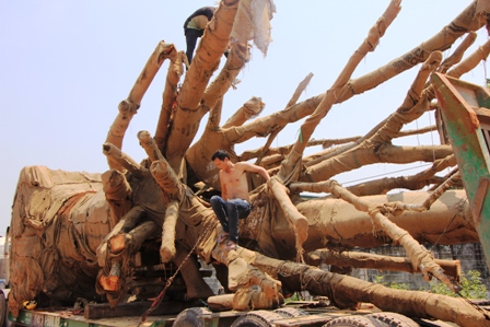 Sáng 13/4, ghi nhận PV cho thấy, tại bãi đất trống thuộc phường Phú Bài (TX Hương Thủy), xe cẩu đã nâng 3 cây cổ thụ lên các xe tải lớn. Để thực hiện công việc này, nhiều nhân công đã phải leo lên các thân cây dùng xích giằng buộc; thêm các thanh gỗ để giữ vững cây trong quá trình vận chuyển. Đến khoảng đầu giờ chiều cùng ngày, các xe này vẫn chưa rời khỏi địa điểm tập kết. Theo kế hoạch, các xe này sẽ vận chuyển cây cổ thụ theo đường tuyến tránh TP. Huế (Quốc lộ 1A) rồi ra Bắc. Các tài xế cùng công nhân làm việc tại đây không tiết lộ về “điểm đến” cụ thể của những cây cổ thụ này.
