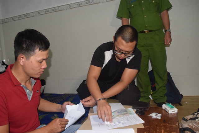 Đối tượng Trung (áo đen) bị bắt giữ cùng tang vật