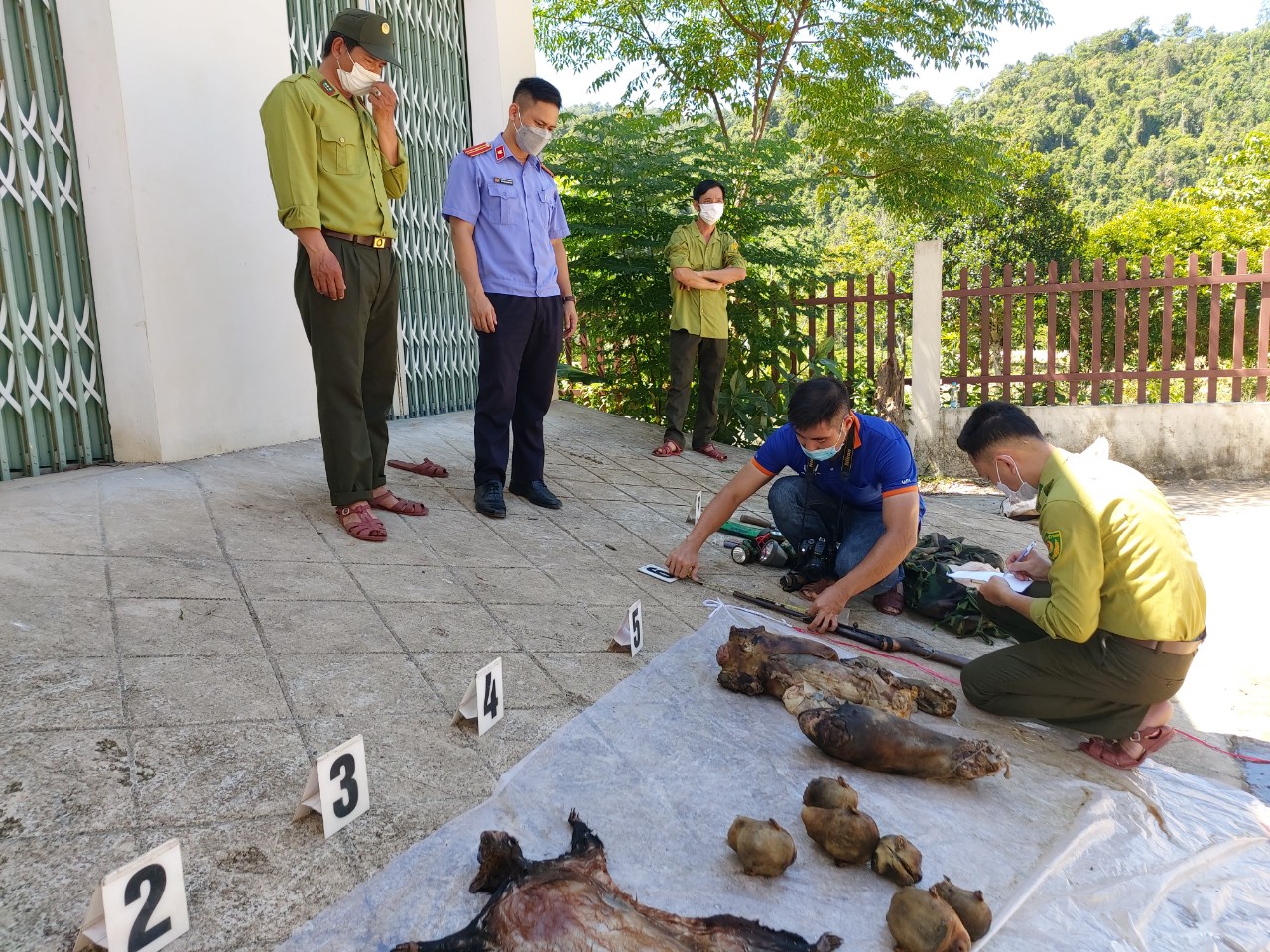 Lực lượng kiểm lâm đã phát hiện nhiều tang vật như súng tự chế, rựa, đèn pin cùng 6 cái đầu của linh trưởng, 2 thân hình linh trưởng, 2 con chồn bay và 1 con chồn hương.