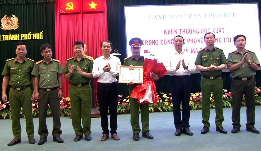 | UVTV Tỉnh ủy, Bí thư Thành ủy Huế Phan Thiên Định và Chủ tịch UBND TP. Huế Võ Lê Nhật trao thưởng cho tập thể Đội Cảnh sát điều tra tội phạm về ma túy Công an TP. Huế |