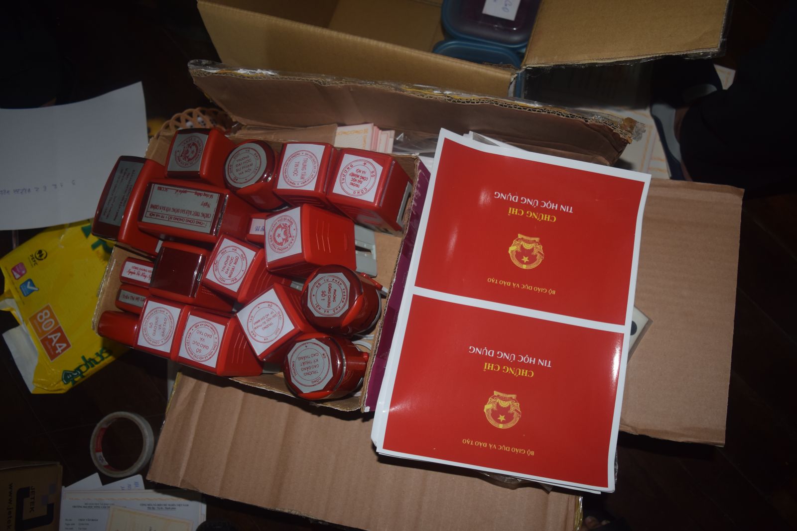 Khám xét tại nơi nhóm đối tượng thuê trọ, cơ quan công an thu giữ 1.500 phôi các loại bằng cấp, giấy chứng nhận, chứng chỉ; 200 con dấu của các trường cao đẳng, đại học, sở GD & ĐT, UBND các cấp; 199 đơn đặt hàng các loại bằng cấp, chứng chỉ đã hoàn thành và giao cho khách hàng; hơn 37 triệu đồng tiền mặt và nhiều máy móc phục vụ việc làm văn bằng, chứng chỉ giả.
