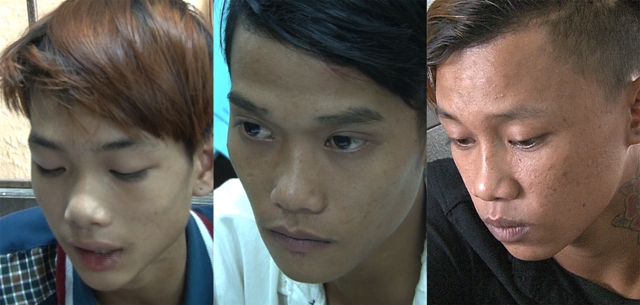 | Các đối tượng cầm đầu Hùng, Hoàng, Út tại cơ quan công an |