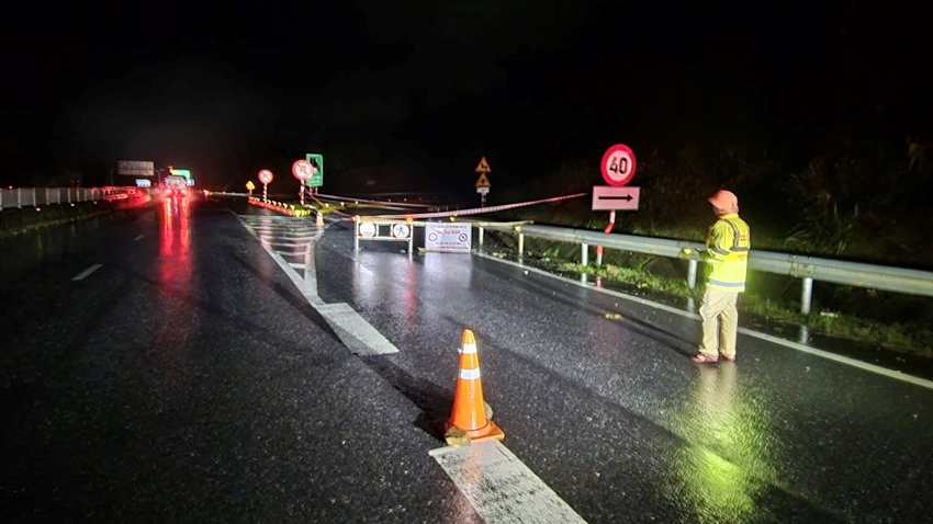 | Lực lượng Cảnh sát giao thông tuần tra, kiểm soát và cắm bảng cảnh báo trên tuyến cao tốc La Sơn - Túy Loan mỗi khi mưa bão |