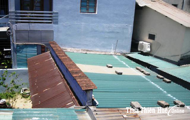 Đường kẻ và cọc sắt ông Mãng kẻ, cắm trên mái tôn và phần đất nhà ông Dũ