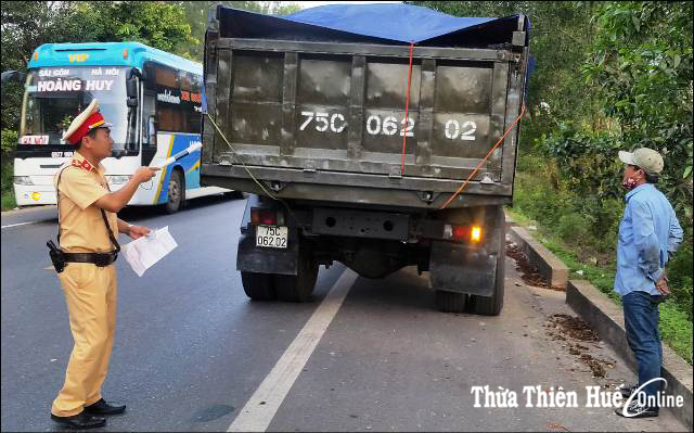 Khi đi trên tuyến tránh Huế đến khu vực phường Phú Bài, chúng tôi bắt gặp tổ cảnh sát giao thông (CSGT) đang kiểm tra một số xe tải chở đất đá, vật liệu xây dựng. Đứng cùng tổ công tác, chúng tôi nhận thấy sau khi đón 5 xe tải thì đã có 3 xe vi phạm các quy định về chở quá khổ, quá tải, thay đổi kích thước thùng xe, lốp mòn… Ngoài việc xử phạt, CSGT còn buộc các lái xe cam kết không vi phạm, nếu tái phạm thì sẽ bị xử lý ở mức cao hơn.