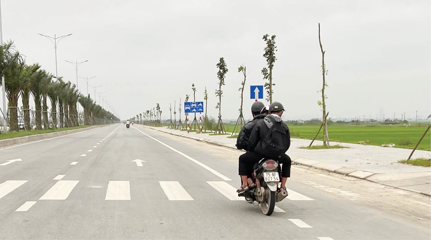 | Học sinh chạy xe máy chở 3 lưu thông trên tuyến đường Phú Mỹ - Thuận An đoạn qua huyện Phú Vang |